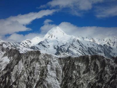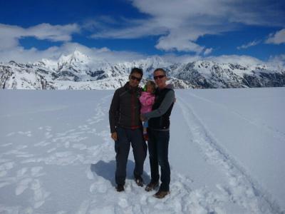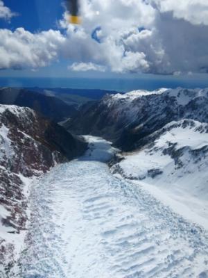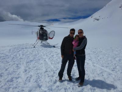 Dann war es endlich soweit und der Flug sollte losgehen. Leider hatte sich der Himmel über die Mittagszeit etwas bewölkt, so dass wir nicht sicher waren, ob alles noch so klappt. Nach kurzem safety briefing ging es auch gleich los, Franzi bei mir auf dem Schoß. Um es vorweg zu nehmen, der Flug inklusive der Landung auf einem Gletscher waren suuuuper, wie die Bilder vielleicht zeigen.