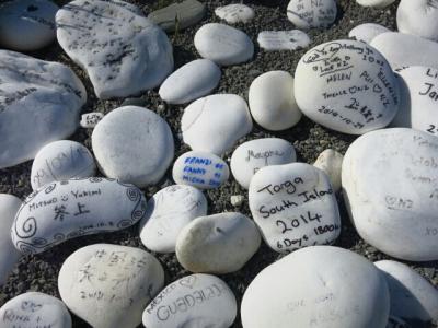 An einer Stelle lagen viele weiße Steine, auf welche sich einige Reisende verewigt haben. Da wollten wir natürlich nicht fehlen (kleiner Stein mit blauer Schrift)...
