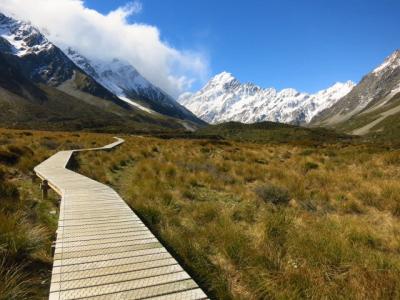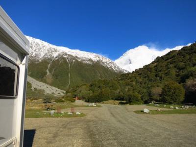 Im WoMo angekommen durfte Franzi erst einmal Mittagsschlaf machen. Fanny war so kaputt, dass sie die Zeit auf für ein kleines Mittagsschläfchen genutzt hat. Nach einem Kaffee, selbst gekochten Grießbrei und ein paar Keksen ging es gegen 16:00 Uhr dann zu unserer zweiten Wanderung, dem Hooker Valley Track. Dieser führte uns auf einem leicht ansteigendem Weg,