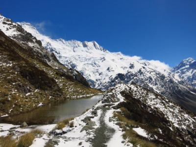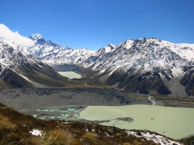 hatten wir eine super Aussicht auf die umliegenden Berge (inkl Mount Cook) sowie den Mueller Lake und den Hooker Lake, an denen wir am Nachmittag vorbei wandern wollten.