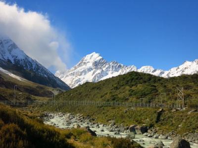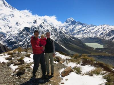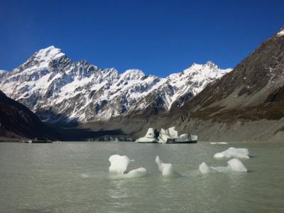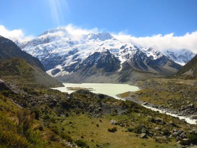 zum Hooker Lake, einem Gletschersee des Hooker Glaciers. Der Gletscher war leider als solcher nur noch schwer zu erkennen, da er mit unheimlich viel Geröll bedeckt ist. Um so schöner waren jedoch der Blick über den See und die Aussicht auf dem Mt Cook!