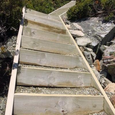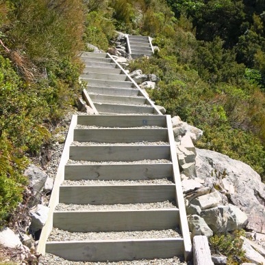 Unsere erste Wanderung heute sollte uns zum Sealy Tarns (Sealy Bergsee) führen. Wir wussten nicht genau was uns erwartet, aber sie ging zumindest vom Zeltplatz los. Anfänglich sind wir (ich mit Franzi auf dem Rücken und Fanny mit dem Verpflegungsrucksack bewaffnet)kurz durch flachen Baumbewuchs gelaufen, bevor dann der Abzweig zu unserem ersten Tagesziel kam. Von da an ging es über Treppenstufen immer weiter nach oben.