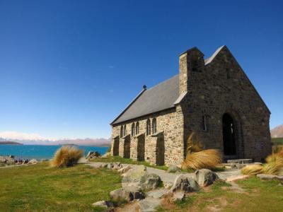 Obwohl die Sonne schon ganz früh durch unser Küchenfenster ins WoMo geschienen hat, haben wir wieder tapfer bis kurz nach acht geschlafen. Das Frühstück fand dann aber im Freien statt und Franzi konnte ihrem Bewegungsdrang fröhnen. Pünktlich zwanzig nach zehn waren wir dann startklar, und nach ein paar Erledigungen im Ort sind wir zur nahegelegenen Lachsfarm gefahren um günstig Abendessen zu kaufen. Leider war der Fisch maßlos überteuert, also ging es ohne weiteren Einkauf ein Stück Richtung Norden zum großen Lake Pukaki. Dort sind wir eine gute Stunde lang über Acker und Weide gewandert, haben schön den See und die Berge gesehen, und wurden wiedermal arg von starkem Sturm belästigt. Weiter ging die Fahrt zum 40km entfernten Lake Tekapo. Wenn vorher Sturm war, dann war hier jetzt Orkan! Ohne Passagier ist der Kinderwagen schon halb weggeflogen, und morgen müssen wir Franzi wahrscheinlich einen Anker an den Fuß binden! Schön ist anders, aber die Sonne schien, und wir haben uns tapfer die doch relativ überschaubare Hauptstraße entlanggekämpft, bis hin zur Old Shepherds Church. Ganz klein und direkt am See gelegen sieht man hinter dem Altar direkt das Bergepanorama, sehr schick!